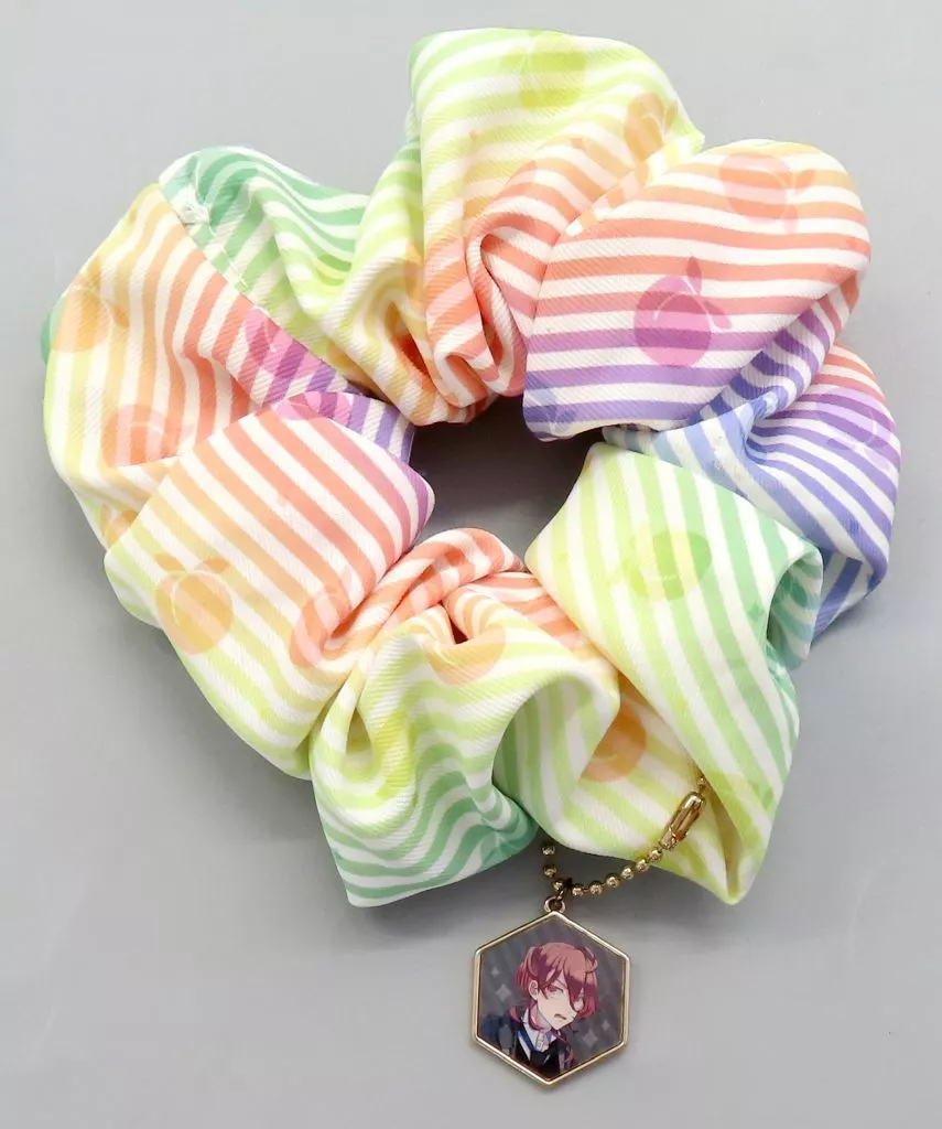 Comes with a rainbow colored stripe x peach patterned scrunchy with a hexagonal charm with member illustrations.