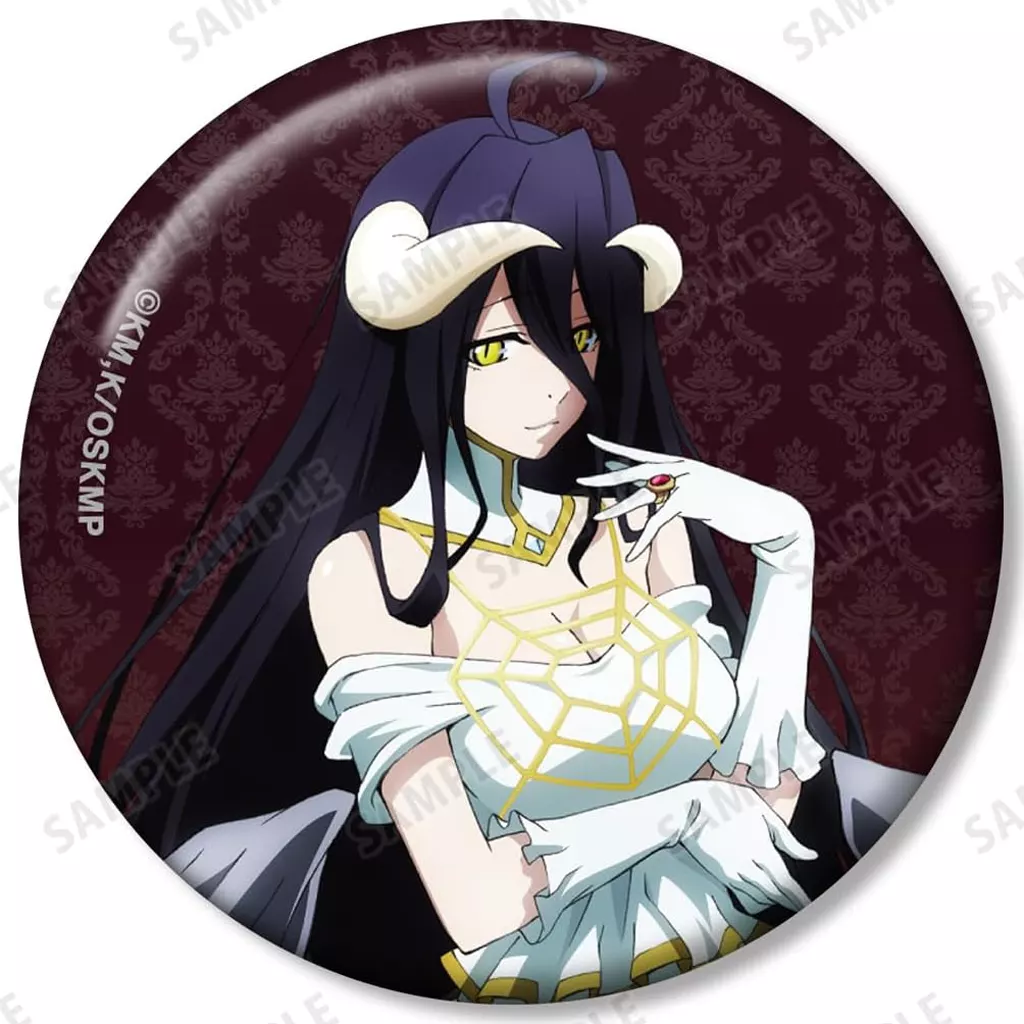 Illustrations of Ainz, Albedo, ヤルダバオト, Naea, Remedios, Kalka, and Celart are made into metal badge.