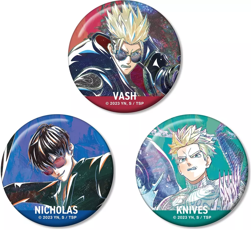 The metal badge 3 piece set is made with the visuals of Bash the Stampede, Nicolas D. Wolfwood, and Millions ナイヴズ expressed attractively with a new touch.