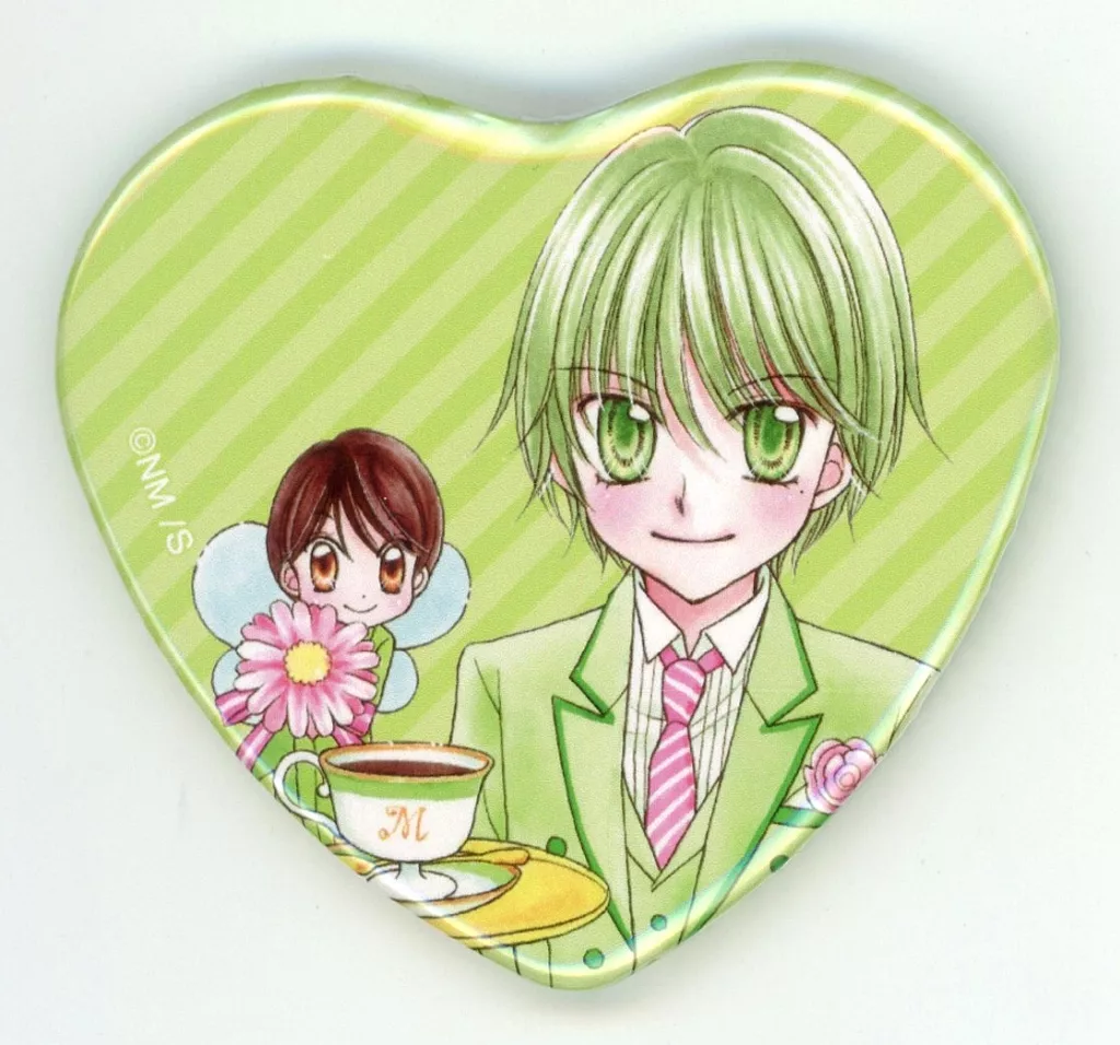 天野いちご、樫野真、安堂千乃介、花房五月、バニラ、ショコラ、キャラメル、カフェの原作イラストをハート型の缶バッジに仕上げました。