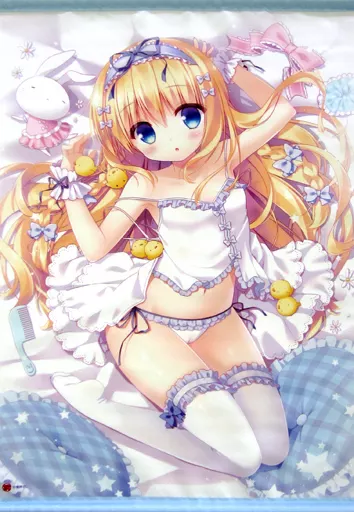 This is an illustration of a blonde hairless woman with a fairy-like lingerie by lying on your back on the bed. br> This is an item with a white base. The one point decoration with light purple emphasizes a feminine look.