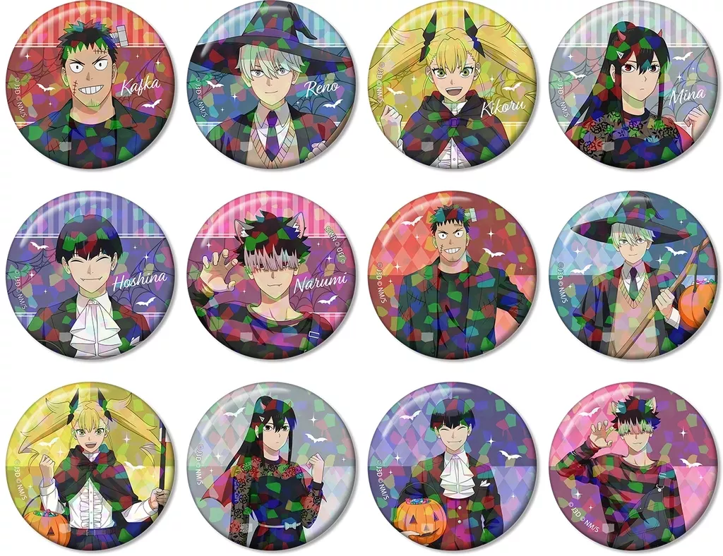 日比野カフカ、市川レノ、四ノ宮キコル、亜白ミナ、保科宗四郎、鳴海弦の描き下ろしイラストをホログラム加工を施した缶バッジに仕上げました。