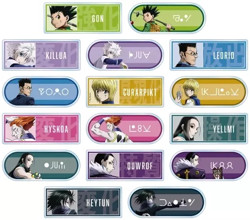 The illustrations by Gon, Kila, Leolio, Kurapika, ヒソカ, Ilmi, Chloro, and Feitan are made into an acrylic name plate with the name of Mr. Character, Hunter letters, and the lineage of Nenki.