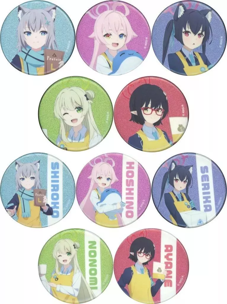 The illustration of Shiroko, Hoshino, Celica, ノノミ, and Ayane is finished into a glitter processed metal badge.