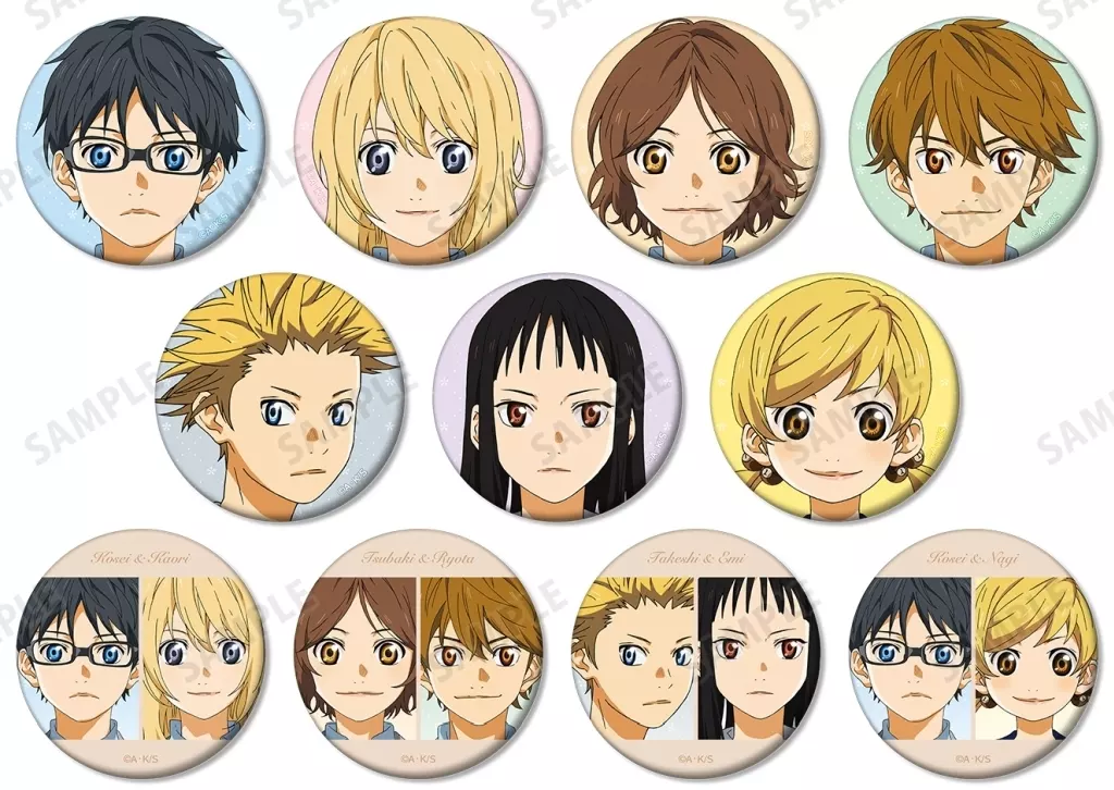 The illustrations of Kimio Arima, Kaori Miyazono, Tsubaki Sawabe, Ryota Watari, Samurai Soza, 絵見 Ikawa, calm sea Soza, and the flower motif of the product logo are made into metal badge with a matte touch.