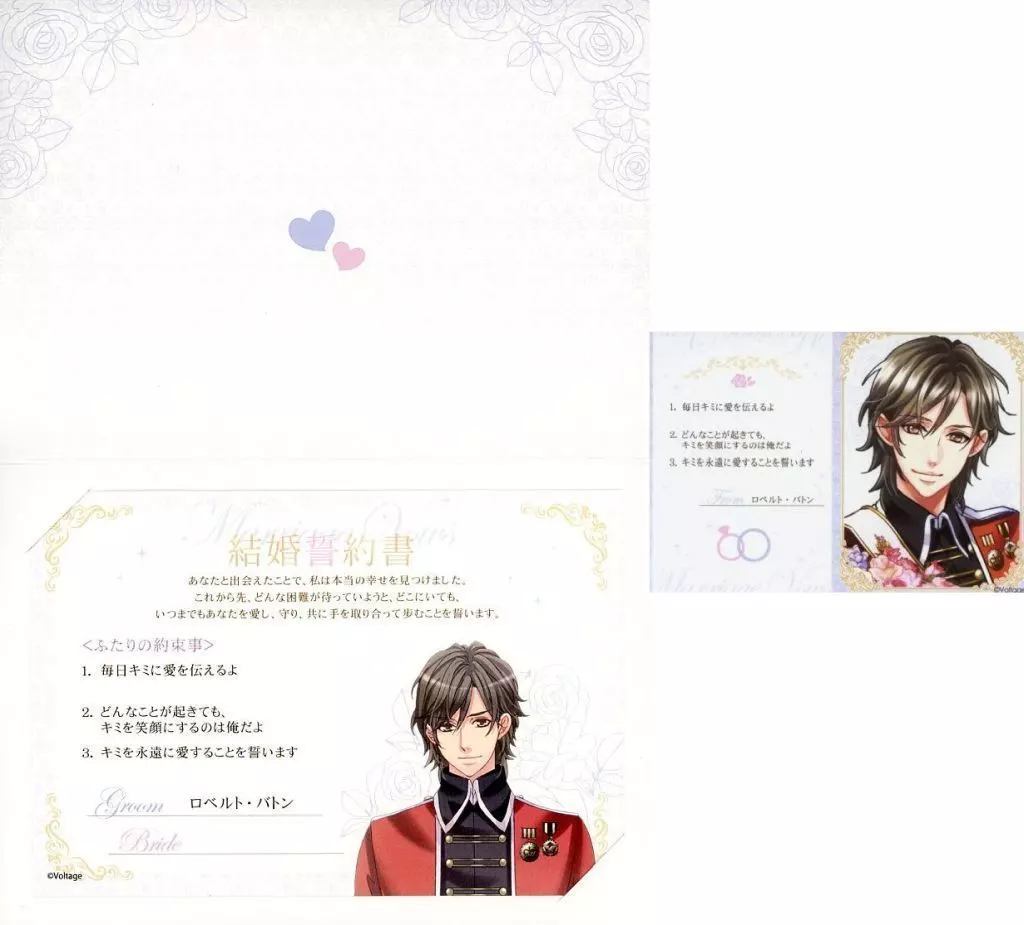 商品解説■「~ボル恋 胸キュンイベント2024~ カレと誓う永遠の愛」グッズの結婚誓約書(ブロマイド付き)です。【商品詳細】サイズ:約188×129mm付属品:ブロマイド、台紙