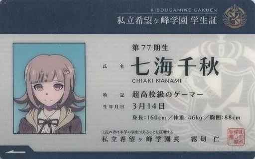 Japanese title: キャラカード(キャラクター) 七海千秋 学生証カード 「ダンガンロンパ in ナンジャタウン 2016-17」 ミニゲーム屋台 ちさ先生の課外授業~ドッキドキ☆After School~ 腐ったみかん賞