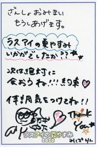 Product explanation ■ This is a "member's handwritten late-summer greeting card single item" sold as a set with "Natsuyasumi 2020T-shirt" which is a limited item for official shop reservation of "Las Eye's Summer Yasumi 2020".