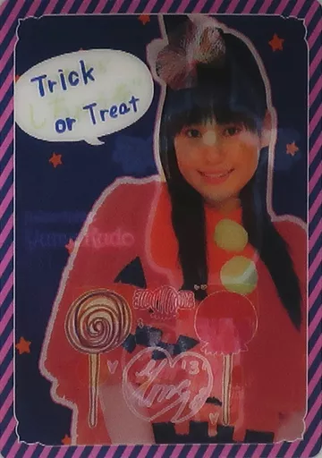 This changing card changes to "Halloween costume visual & handwritten print comment" or "Halloween costume visual & handwritten print illustration" when it is tilted vertically forward and backward.