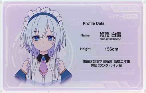 Japanese title: キャラカード 姫路白雪 プロフィールアクリルカード 「DMMスクラッチ! ライアー・ライアー」 D-2賞