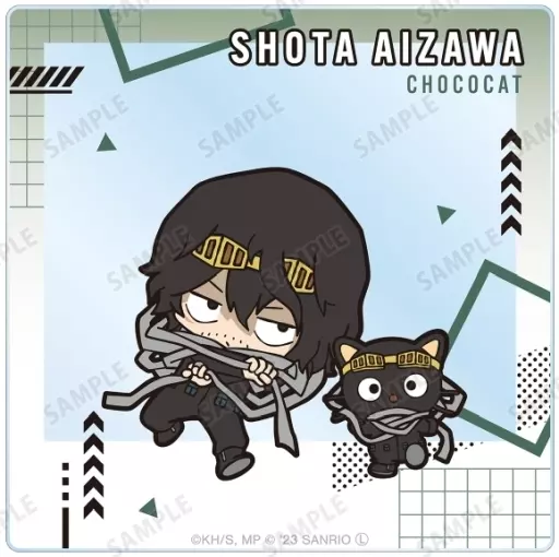 Acrylic card with the visuals of almite × Hello Kitty, Aizawa Shuta × Choco Cat, Endeavor × Pom-Pom-Pudding, Hawks × Duck Peckle, Death-Grip Wood Mourning × Gudetama, cremation × ハンギョドン, トガヒミコ × Chromi, Twais × Osaru Montsuki.