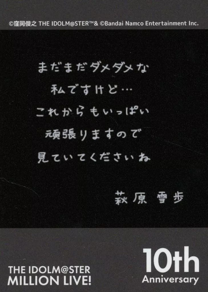 Japanese title: キャラカード 萩原雪歩(レアver.) 「THE IDOLM@STER MILLION LIVE! 10th Anniversary Final Shop in コトブキヤ秋葉原館 トレーディングインスタントフォト風カード リ・プロローグ・Xver.」