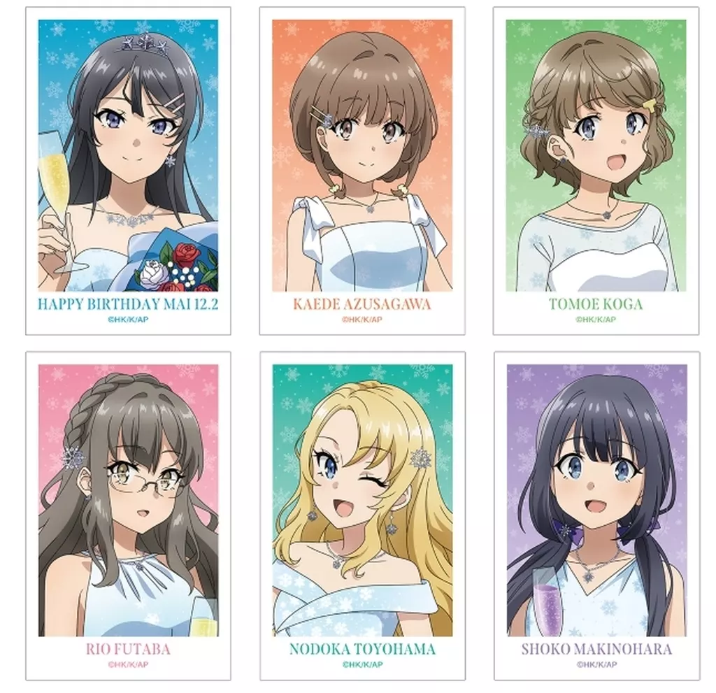 The instant camera style illustration cards include Asaginu Sakurajima, Kaede Azusagawa, Tomoe Koga, Rio Futaba, Nonaka Toyohama, Shoko Makinohara, and Happy Birthday.