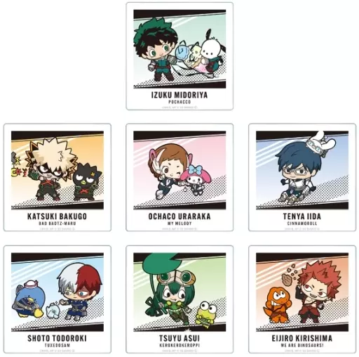 We have created an acrylic card with the visuals of Midoriya Dehisa x Pochakko, Katsuki Bakugo x Bad Badtz-maru, Ochaco Uraraka x My Melody, Iida Tenya x Cinnamoroll, Shoto Todoroki x Tuxedo Thumb, Asui Tsuyu x KEROKEROKEROPPI, Eijiro Kirishima x Weir Dinah ソアーズ.