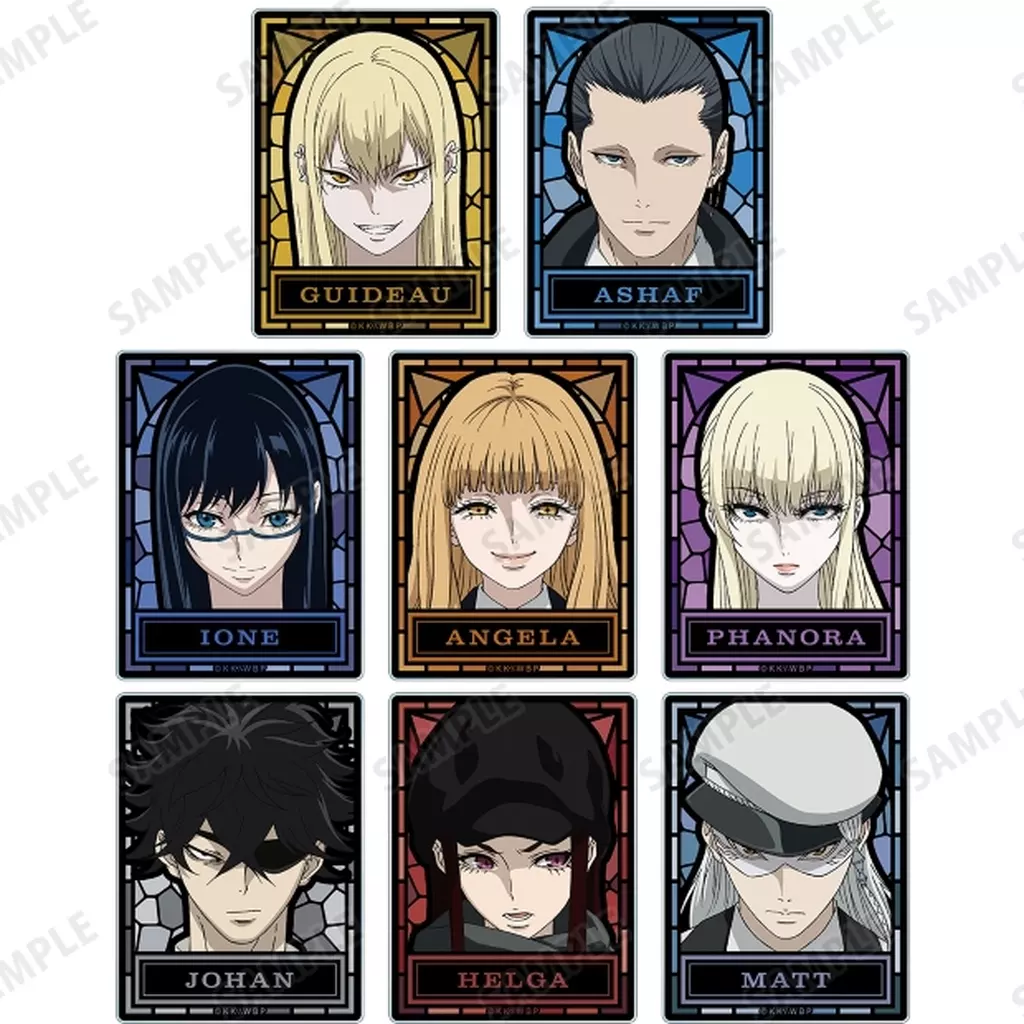 The illustrations of Guido, アシャフ, Ione, Angela Anne Fuer, Fanora Christofle, Johan, Helga Velvet, and Matt Couga are made into an acrylic card.
