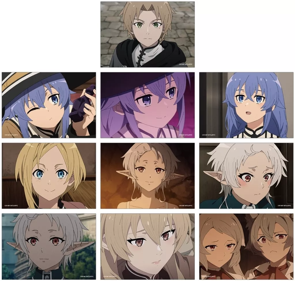 The impressive scenes of Rudeus Greyrat, Roxy ミグルディア, Sara, シルフィエット, Erinarise Dragon Road, Linana デドルディア, and Plsena Adoldia are finished in a bromide.