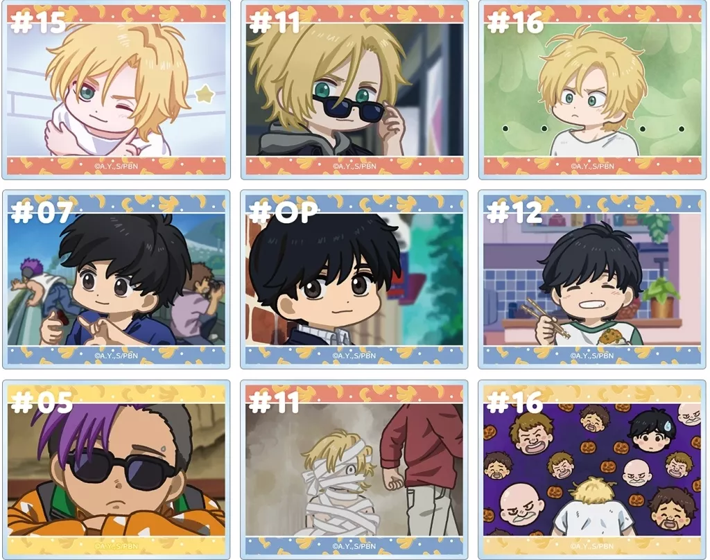The loose spinning illustrations of the impressive scenes of Ash Lynx, Eiji Okumura, Shuter Won, Max Robo, Dino F ゴルツィネ, and Shunichi Imbe are made into an acrylic card.