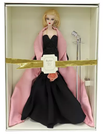 Doll body, scarf (pink), dress (black), gloves (black), earrings, stand microphone, high heel (black), support, doll stand
