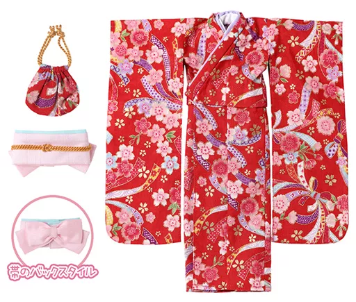 Furisode (Red / Cherry Blossom Pattern), Obi (Pink), drawstring bag Bag