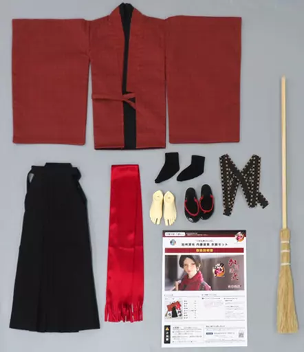 It comes with a tailored kimono made of checkered fabric, a tabi with a particular length and checkered pattern, a geta with glossy black paint, and even a broom that matches perfectly with a doll size.