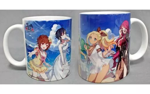 A tropical style full color mug with 5 girls and 5 devils in the background of a resort!