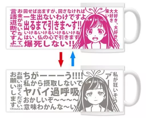 It uses a special ink that reacts to temperature, and when you put a hot drink in the mug, it changes from a positive Kizuna AI who is full of motivation to turn it until it comes out to a negative Kizuna AI.
