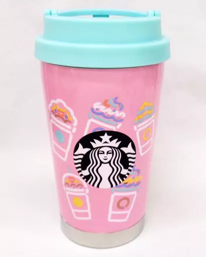 This stainless steel tumbler has a frappuccino motif drawn on the pastel pink body.