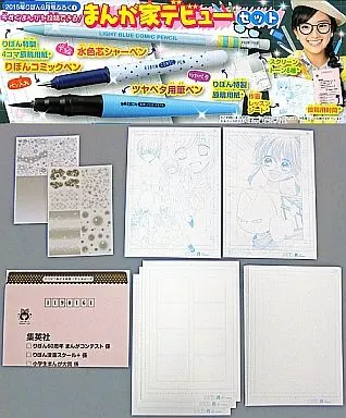 Light blue core mechanical pencil, Ribbon comic pen, Glossy solid brush pen, 3 sheets of Ribbon special 4 frame genko yoshi paper, 8 sheets of Ribbon special genko yoshi paper, 8 kinds of screen tone (2 sheets), 2 drawing lesson sheets, envelopes for posting.