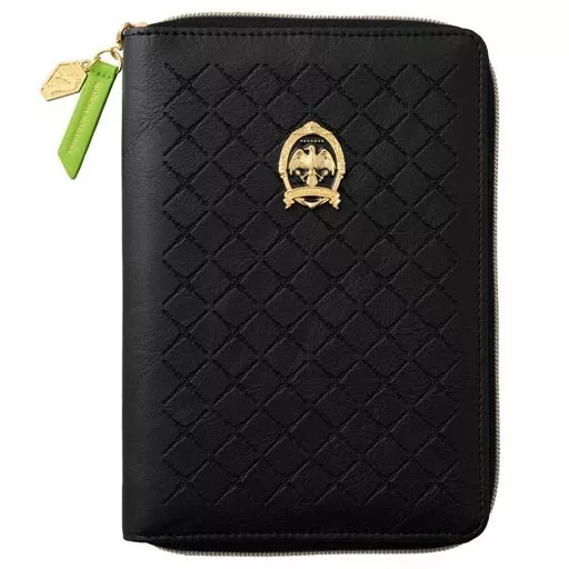 On the inside pocket, there is an embossed design of the work logo, and on the inside fabric, there is a design of stripes that symbolize the work.