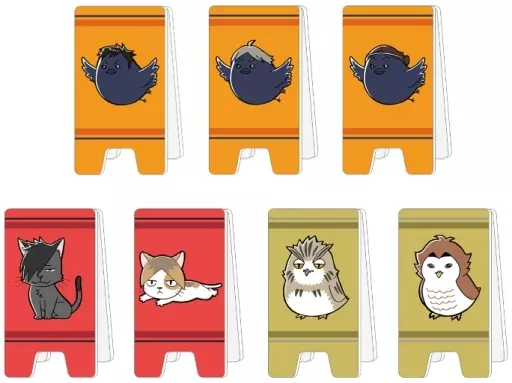 The mascot series visual of sour Mura glass, Suga Glass, Azumine glass, クロオネコ, Ken Mameco, ボクトフクロウ, and Akaashi-owl is finished into an memo stand with an acrylic billboard style.