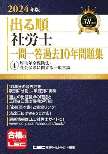 過去10年(平成26年-令和5年)の択一式本試験問題を一肢ごとに分解し、科目別・項目別に並べて収録した一問一答問題集。より精密な知識定着が可能!令和5年の本試験問題を追加し、10年分を掲載しています。近年の社労士試験においては、「過去問の焼き直し」といえない出題が増えており、過去問をベースとしながらも、精密な知識が問われる試験へと変化してきています。そこで、【一肢一肢の根拠(正誤の理由)をきちんと検討する】一問一答形式での過去問学習は、知識の定着化を図るという点で高い効果を得られます。さらに、試験本番は5肢択一式。それに対応するためには、【他の選択肢と相対的に比較すること】が必要になります。本書による知識のチェックに加え、5肢択一式の『必修過去問題集』による演習を併用することで、より効果的に実力を磨くことができます。◆ 本書の特長 ◆【1】『出る順社労士必修基本書』の該当ページを掲載。知識の確認に役立ちます。【2】一肢一肢を見抜く力を養えます!【3】同シリーズ『必修過去問題集』と並行することで学習がより効果的に!【4】「赤シート」付きなので、重要項目の暗記にも最適。○本書発刊後の法改正情報はWEBでフォロー!本書収録の内容について、「2024年社労士試験で適用される法令基準日」までの法改正が生じた場合も補正情報を適宜掲載予定です。※補正情報の閲覧にはインターネット上のホームページにアクセス可能なPC環境が必要となります。※本試験の最新情報はLEC社労士サイトで案内しています。『2024年版 出る順社労士 一問一答過去10年問題集』は分野別に4書籍に分けて細かくカバーしています。 ・1 労働基準法・労働安全衛生法・労働者災害補償保険法 ・2 雇用保険法・労働保険の保険料の徴収等に関する法律・労務管理その他の労働に関する一般常識 ・3 健康保険法・国民年金法 ・4 厚生年金保険法・社会保険に関する一般常識