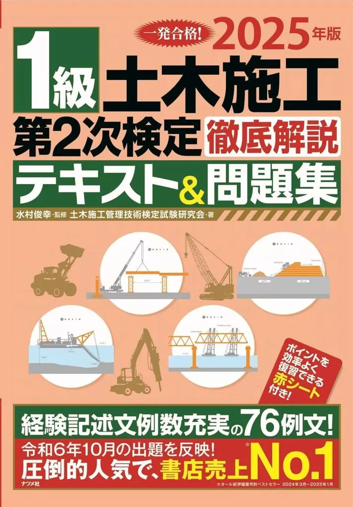 ■経験記述問題の記述例を豊富に紹介現場監督という実務経験のなかで、技術的な課題やその課題を解決するために検討した内容、現場で実施した処置などを記述する経験記述問題は、第2次検定のもっとも大きな山場です。本書では、38の工事、76もの記述例を掲載しました。道路、上下水道、河川、造成などの工事の種類ごとに、アスファルト舗装、管敷設工、護岸工、トンネル工などの工種、品質管理、工程管理、出来形管理、安全管理、環境保全などの管理項目を取り交ぜ、さまざまなバリエーションを候補に挙げています。■最新の1級土木施工第2次検定試験を反映令和6年度試験では、経験記述問題の出題形式が変更となっています。本書では、新しい出題形式に合わせて、[工事概要][設問1][設問2]という形式で記述例を掲載しており、自身の経験に合わせて、参考とすべき記述例が探しやすくなっています。■学科記述問題、模擬試験、出題傾向と過去問題も掲載第2次検定の後半試験の学科記述問題について、各分野について解説するとともに、それぞれの分野に例題演習を用意しました。巻末には、過去問セレクト模擬試験一回分を掲載。さらに別冊では、出題傾向の分析結果と最新2年分の過去問題を掲載しました。本試験形式の問題を解くことで、効果的に復習できます。【目次】第1部 経験記述第2部 学科記述付録 過去問セレクト模擬試験別冊