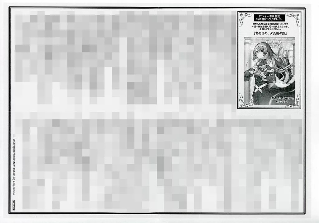 1枚仕様こちらの商品は、ライトノベル「捨てられ聖女は優雅に退場いたします ~国の破滅を選んだのは貴方たちです。後悔しても知りません~」の書泉・アニメイト購入特典になります