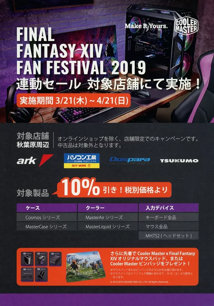 販促品 演劇 フライヤー)FINAL FANTASY XIV FAN FESTIVAL 2019 連動セール 対象店舗にて実施!(実施期間3/21(木)~4/21(日) 対象店舗 秋葉原周辺 対象製品 10%引き!税別価格より)