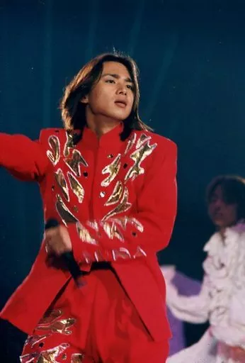 Official photo (Johnnys) / idol / Kinki Kids Kinki Kids / Koichi Domoto / Live Photo, Above the Knees, Costume Red Gold, Right Hand Lift, Left Hand Microphone, Right Eye, No Frame / Johnnys Family Club Official photo