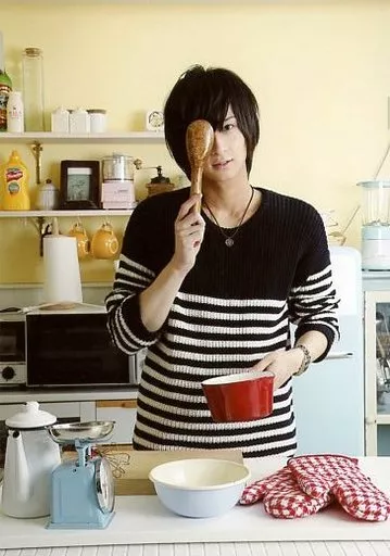 Japanese title: 生写真(男性)/俳優 荒牧慶彦/上半身・衣装黒・白・ボーダー柄・右手木ベラ右目・左手鍋/「荒牧慶彦Special Event ちょっと早いけどやっちゃいます! クリスマスパーティー2014」ブロマイドくじ