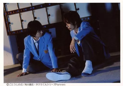 Japanese title: 生写真(男性)/俳優 柳下大・加藤慶祐/横型・全身・座り・衣装青・制服・柳下両手付き・顔合わせ/タクミくんシリーズ映画「そして春風にささやいて」