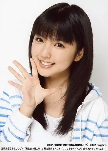 Japanese title: 生写真(ハロプロ)/アイドル/Hello! Project 真野恵里菜/バストアップ・衣装白・ボーダー・右手パー・背景白・2Lサイズ/真野恵里菜8thシングル『元気者で行こう!』発売記念イベント「マノソナタ~イベント盛り上がっちゃいなよ~」