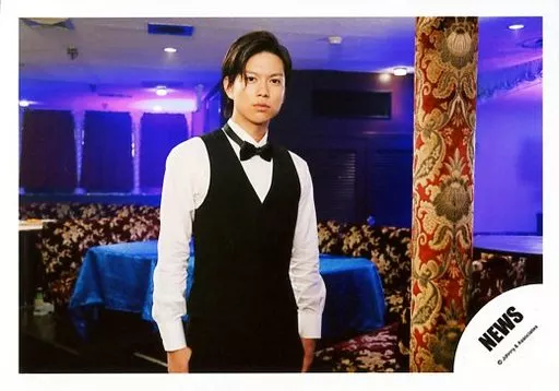 Japanese title: 生写真(ジャニーズ)/アイドル/NEWS NEWS/加藤シゲアキ/横型・上半身・衣装白・黒・蝶ネクタイ・右向き・口閉じ・柱・両手下・ライト紫/「NEWS LIVE TOUR 2015 WHITE」DVD特典映像撮影/公式生写真