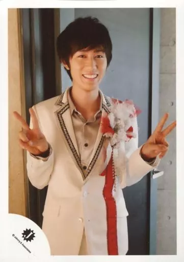 Japanese title: 生写真(ジャニーズ)/アイドル/Snow Man Snow Man/阿部亮平/膝上・衣装白赤・黒銀・両手ピース・歯見せ/15夏 滝沢歌舞伎 10th Anniversary シンガポール公演 パンフレット撮影オフショット/公式生写真