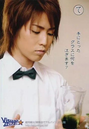 Japanese title: 生写真(男性)/俳優 鎌苅健太/バストアップ・シャツ白・蝶ネクタイ緑・左手グラス・『て』/Visualストーリー鎌苅健太「喫茶店でアルバイト」未公開