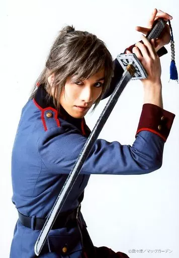 Kei Hosogai (Abeno Sosei) / Kneecap / Costume blue / Red / Black / Right-facing / Double-handed / Character Actor Shot / Stage 「 LAUGHING UNDER THE CLOUDS 」 Ticket Advance Special Bromide