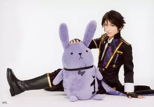 Japanese title: 生写真(男性)/俳優 校條拳太朗(睦月始)/横型・座り・全身・衣装黒・白・紫・黄色・「ツキウサ。」ぬいぐるみ・キャラクターショット/舞台「2.5次元ダンスライブ『ツキウタ。』ステージ」トレーディングブロマイド