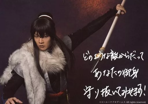 Japanese title: 生写真(男性)/俳優 横山真史(森蘭丸)/横型・上半身・衣装黒.グレー・右手下げ・左手槍・背景黒・印刷メッセージ入り/舞台「下天の華 夢灯り」会場限定販売 トレーディング生写真