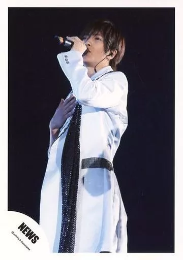Japanese title: 生写真(ジャニーズ)/アイドル/NEWS NEWS/山下智久/ライブフォト・膝上・衣装白・黒ストール・右手パー胸・左手マイク口元・体左向き・背景黒/公式生写真