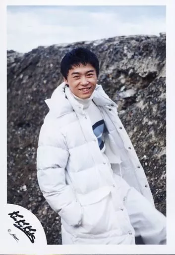 Japanese title: 生写真(ジャニーズ)/アイドル/Kinki Kids Kinki Kids/堂本剛/膝上・ダウンコート白・右手ポケット・左足前・体右向き・笑顔・背景野外・岩壁/公式生写真