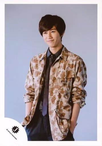 Japanese title: 生写真(ジャニーズ)/アイドル/Snow Man Snow Man/阿部亮平/膝上・衣装茶.白.青・迷彩柄・両手ポケット・背景グレー/『少年たち 危機一髪』パンフレット&グッズ撮影オフショット/公式生写真