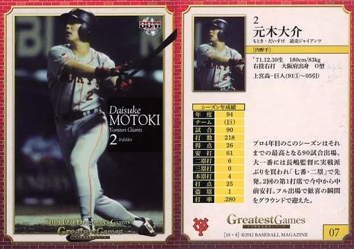 BBM / Regular Card / Yomiuri Giants / BBM2012 Greatest Games 「 10.8 Battle 1994 Chunichi VS Giant 」 07 [Regular Card] : Daisuke Motoki
