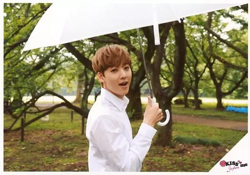 Official photo (Male) / Singer / U-KISS U-KISS/Kevin / Horizontal, Upper Body, Costume White, Facing, Right Hand Umbrella, Background Green, Logo "KISS me JAPAN" / Official Official photo
