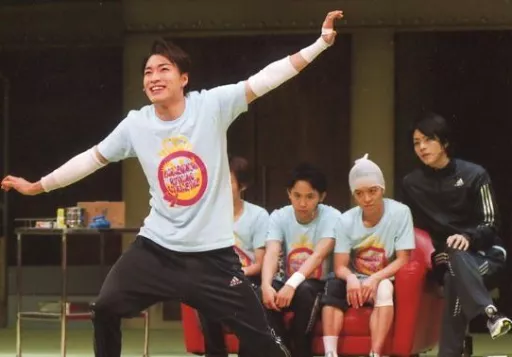 Japanese title: 生写真(男性)/俳優 松下優也(望月宙)/ライブフォト・横型・衣装水色.黒・両手広げ・左手上げ・後ろ須賀健太.廣瀬智紀.加藤真央/舞台「タンブリング FINAL」会場限定生写真